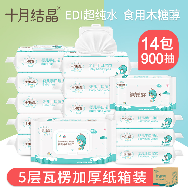 施俞儿母婴专营店十月结晶婴儿湿巾纸宝宝手口屁专用湿纸巾大包装80抽10包+25抽4包14包900抽,EDI超纯水,防止红屁屁